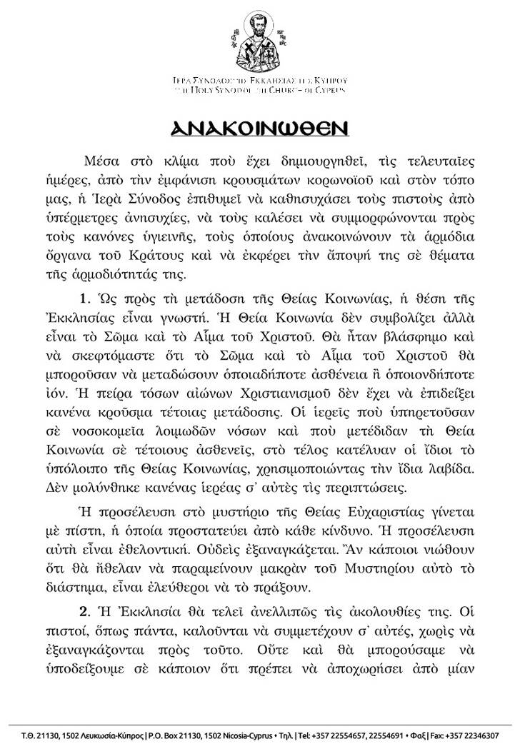 Τη συνέχιση των ακολουθιών της αποφάσισε η εκκλησία της Κύπρο όπως μάλιστα επισημαίνει σε σχετική της ανακοίνωση ο κορονοϊός δεν μπορεί να μεταδοθεί με τη Θεία Κοινωνία.