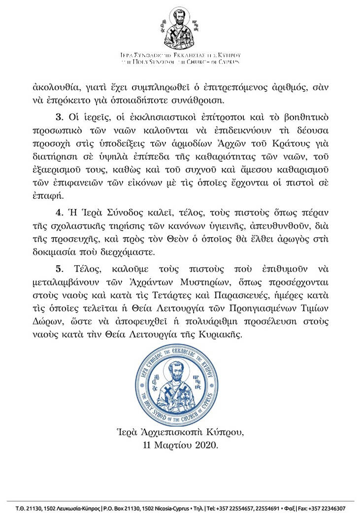 «Η Εκκλησία της Κύπρου θα συνεχίσει ανελλιπώς να τελεί τις ακολουθίες» επισημαίνει η Ιερά Σύνοδος και παράλληλα καλεί τους εκκλησιαστικούς επιτρόπους και το βοηθητικό προσωπικό των ναών να ακολουθήσουν τις υποδείξεις των αρχών του Κράτους.
