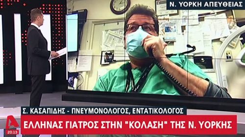 «Εδώ είναι κόλαση. Είναι πόλεμος. Οι ασθενείς έρχονται εδώ και το 20% γίνεται καλύτερα και το άλλο 80% πεθαίνει», είπε ο Σωτήρης Κασαπίδης μιλώντας στην κάμερα του κεντρικού δελτίου ειδήσεων του Alpha για τη μάχη κατά του κορονοϊού που δίνει εκεί.