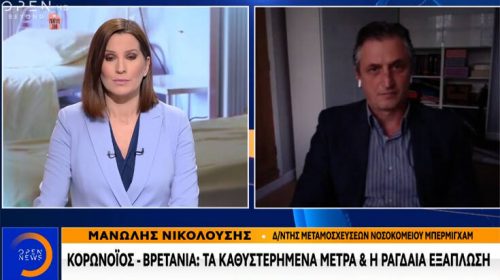 Για την εξάπλωση του φονικού κορονοϊού και την κατάσταση που επικρατεί στην Ελλάδα και τη Βρετανία μίλησε σε τηλεοπτική του συνέντευξη ο Έλληνας διευθυντής μεταμοσχεύσεων του νοσοκομείου του Μπέρμιγχαμ, Μανώλης Νικολούσης.