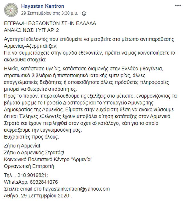 Το Κοινωνικό Πολιτιστικό Κέντρο «Αρμενία», το οποίο εδρεύει στην Αθήνα, έκανε δημόσιο κάλεσμα –και μέσω Facebook– στην αρμένικη διασπορά για εθελοντική κατάταξη στο στρατό της Δημοκρατίας της Αρμενίας.