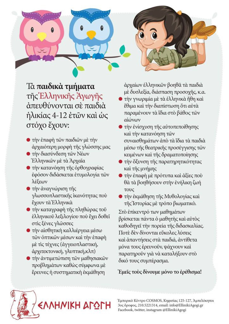 Στην Ελληνική Αγωγή τα παιδιά έρχονται σε επαφή με την αρχαία ελληνική γλώσσα.