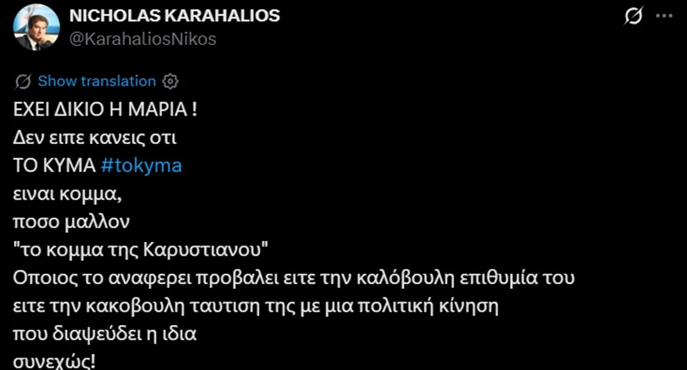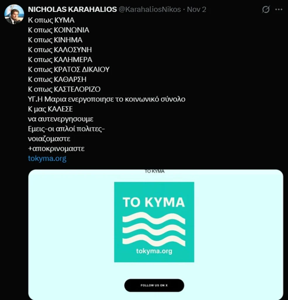 Η Καρυστιανού, φυσικά, έσπευσε να διαψεύσει ότι έχει σχέση με το εν λόγω «Κύμα». Ο Καραχάλιος άρχισε το πήγαινε-έλα των διευκρινίσεων, σαν να μην είχε καταλάβει τι ακριβώς δημοσίευσε. Αλλά το κακό έχει ήδη γίνει.