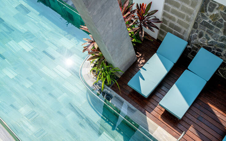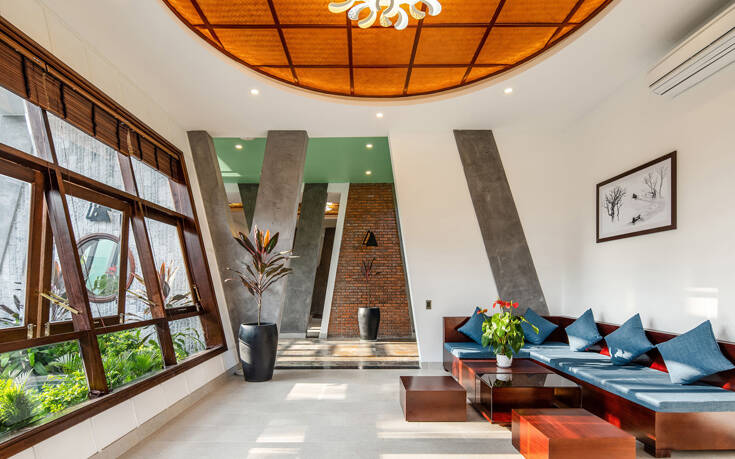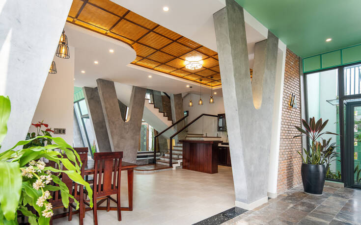Γι’ αυτό και η εύπλαστη φόρμα του σπιτιού ακολουθεί την εντύπωση που αφήνουν τα τοπικά φυτά, ιδιαίτερα ο φοίνικας που ζει εδώ.