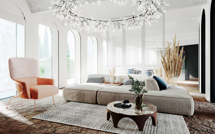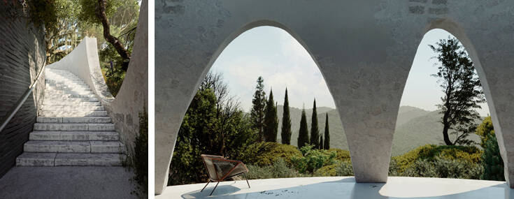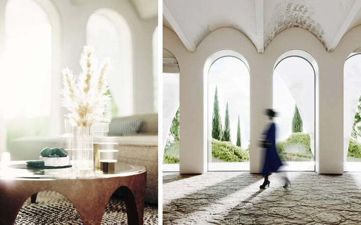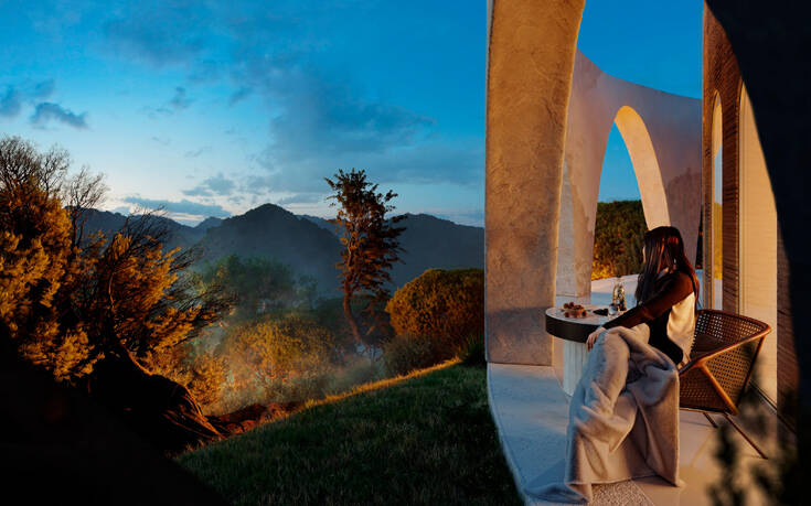 Τα δωμάτια διατάσσονται γύρω από μια κεντρική αυλή, την ίδια ώρα που οι αυθεντικές αψίδες της περιμέτρου λειτουργούν ως παράθυρα στον κόσμο, καδράροντας τη θέα στη γύρω βουνά.
