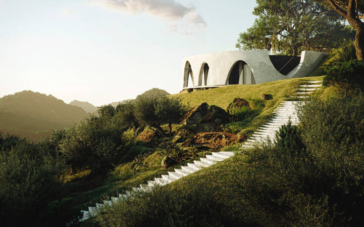 Ο αρχιτέκτονας και γραφίστας Bartosz Domiczek οραματίστηκε μια σύγχρονη κατοικία που επιβλέπει έναν ελαιώνα.