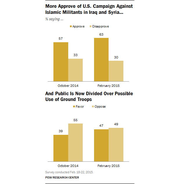 Όπως κατέδειξε έρευνα του Ινστιτούτου Pew Research, σχεδόν ένας στους δυο Αμερικανούς,47%, τάσσεται υπέρ της αποστολής χερσαίων στρατευμάτων, για την ουσιαστική αντιμετώπιση του ακραίου φονταμενταλισμού.