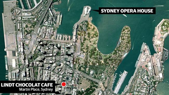 Ο ή οι δράστες (πληροφορίες αναφέρουν ότι οι αρχές έχουν δει τρεις ενόπλους) εικάζεται ότι κρατούν ομήρους 40 άτομα, 10 εργαζομένους και 30 πελάτες του Lindt Chocolate Cafe στην Μάρτιν Πλέις, μια πεζοδρομημένη πλατεία στην επιχειρηματική συνοικία του Σίδνεϊ. Τοπική τηλεόραση έδειξε εικόνες στις οποίες όμηροι κρατούσαν μια μαύρη σημαία με λευκή αραβική επιγραφή σε παράθυρο του καταστήματος. Φαίνεται πως πρόκειται για τη σαχάντα, τη μουσουλμανική ομολογία της πίστης: «Δεν υπάρχει Θεός παρά μόνο ο Αλλάχ και ο Μωάμεθ είναι ο Προφήτης Του».