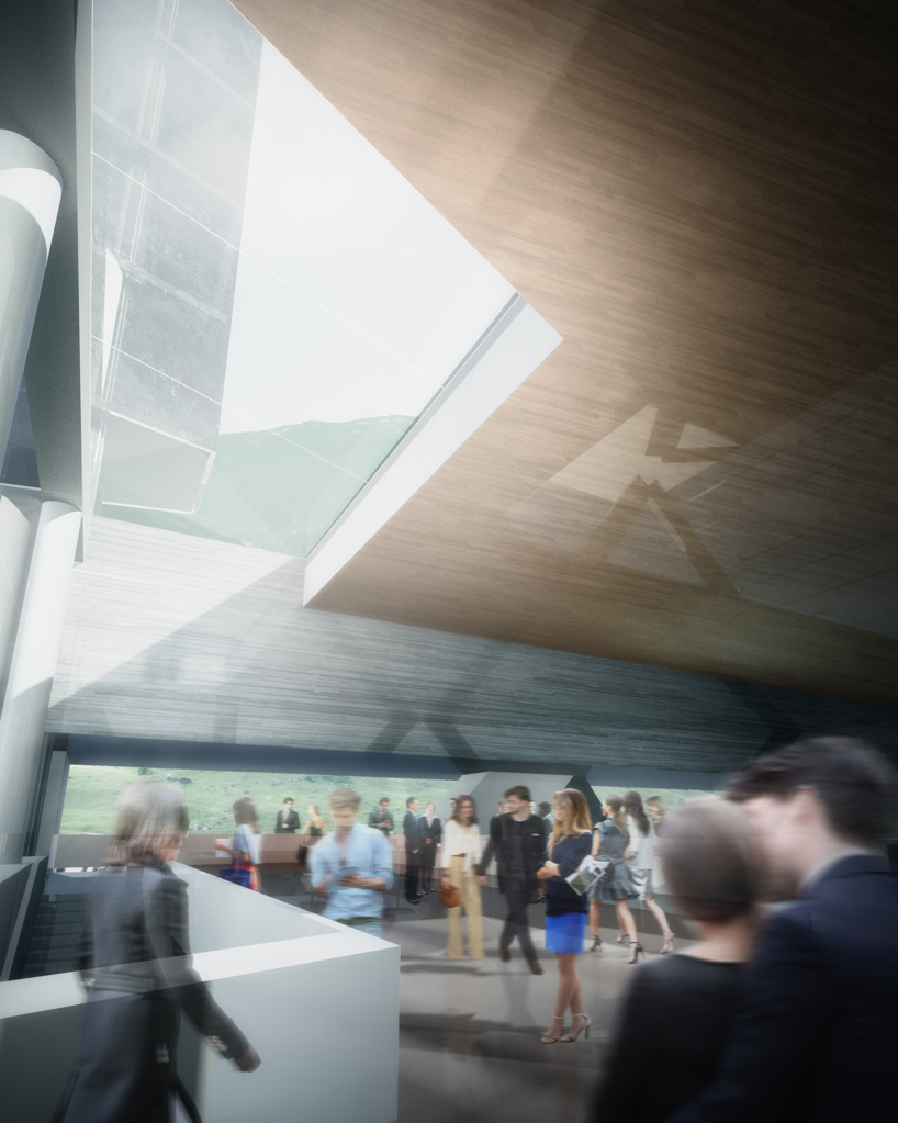 Στην κορυφή του ουρανοξύστη στεγάζεται μπαρ- εστιατόριο , με τους ταξιδιώτες να μαγεύονται από την θέα των χιονισμένων ελβετικών κορυφών.