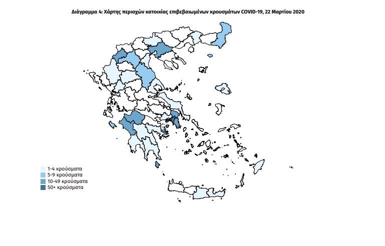 Σύμφωνα με την ημερήσια έκθεση (22 Μαρτίου) του ΕΟΔΥ, σε τουλάχιστον 28 από τις 74 περιφερειακές ενότητες της χώρας υπάρχουν, πλέον, επιβεβαιωμένα κρούσματα κορονοϊού.
