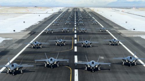 Επίδειξη δύναμης πραγματοποίησε η Πολεμική Αεροπορία των ΗΠΑ, με 52 πλήρως οπλισμένα μαχητικά Stealth τύπου Lightning II να απογειώνονται το ένα πίσω από το άλλο, σε ένα «κύμα» απογείωσης, αφότου αρχικά είχαν παραταχθεί σε έναν εντυπωσιακό σχηματισμό σε διάδρομο προσαπογείωσης.