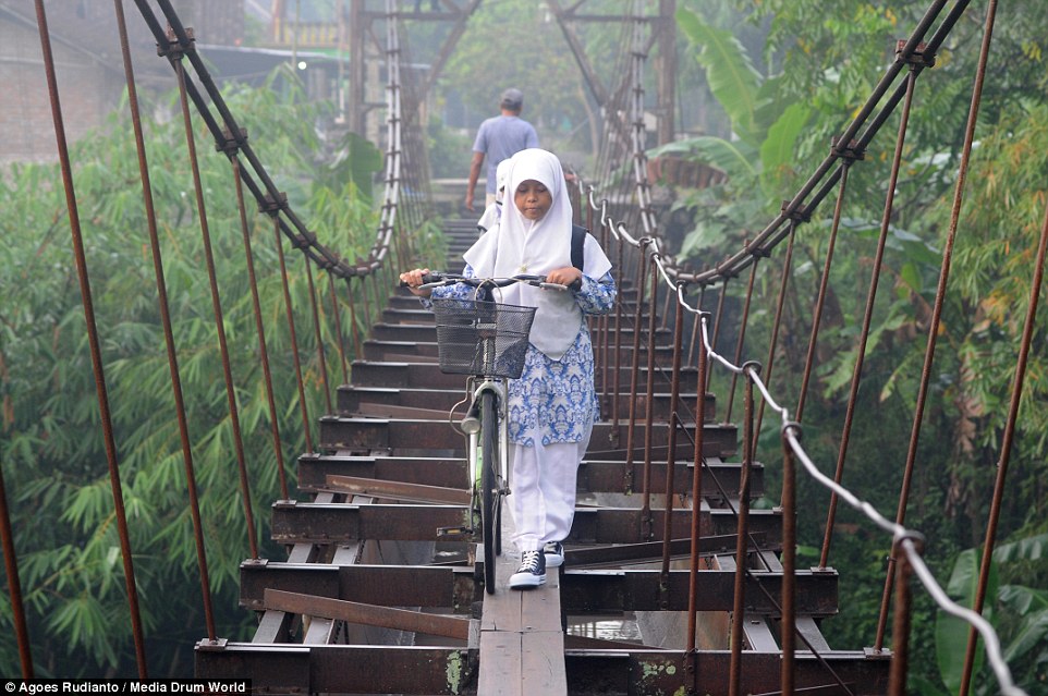 Ο φωτογράφος Agoes Rudianto απαθανάτισε τους ατρόμητους λιλιπούτειους Ινδονήσιους, οι οποίοι προτιμούν να περπατούν ή να περνούν με το ποδήλατο την γέφυρα από το να χρησιμοποιούν τη διαδρομή μέσα από τη ζούγκλα.