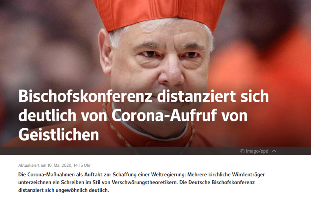Η γερμανική Αρχιεπισκοπή πήρε αποστάσεις από επιστολή επισκόπων από διάφορες χώρες, οι οποίοι αντιδρούν στα μέτρα περιορισμών λόγω κορωνοϊού, τονίζοντας πως όλα αυτά οδηγούν σε «παγκόσμια κυβέρνηση, η οποία θα έχει τον απόλυτο έλεγχο».