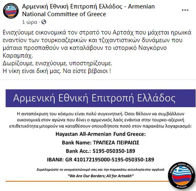 Έρανο για την οικονομική ενίσχυση των αρμενικών δυνάμεων της Δημοκρατίας του Αρτσάχ (Ναγκόρνο Καραμπάχ), που αμύνονται ενάντια στους Αζέρους Τούρκους και τους τζιχαντιστές μισθοφόρους, πραγματοποιεί η Αρμενική Εθνική Επιτροπή Ελλάδος.