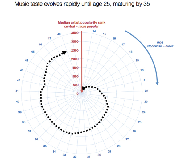 Συγκεκριμένα η έρευνα αναφέρει ότι φτάνουμε σε μία μουσική ωριμότητα γύρω στα 35 ενώ μετά τα 40 επιστρέφουμε σε δημοφιλή ακούσματα ίσως σε μία υποσυνείδητη προσπάθεια παλιμπαιδισμού.