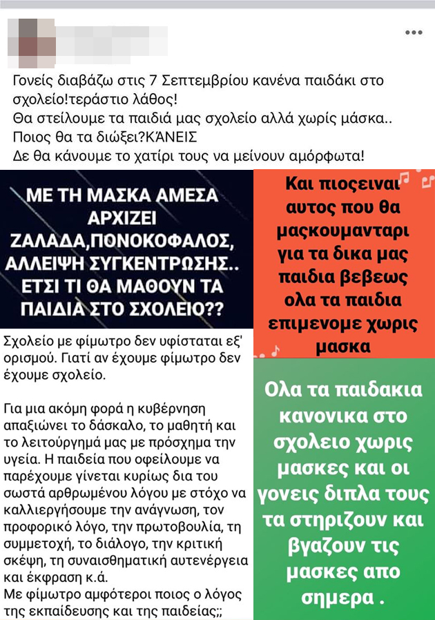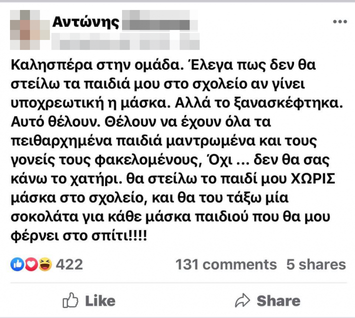 «Καλησπέρα στην ομάδα. Έλεγα πως δεν θα στείλω τα παιδιά μου στο σχολείο αν γίνει υποχρεωτική η μάσκα. Αλλά το ξανασκέφτηκα. Αυτό θέλουν. Θέλουν να έχουν όλα τα πειθαρχημένα παιδιά μαντρωμένα και τους γονείς τους φακελομένους, Όχι … δεν θα σας κάνω το χατήρι. θα στείλω το παιδί μου ΧΩΡΙΣ μάσκα στο σχολείο, και θα του τάξω μία σοκολάτα για κάθε μάσκα παιδιού που θα μου φέρνει στο σπίτι!!!!», γράφει ένας χρήστης.