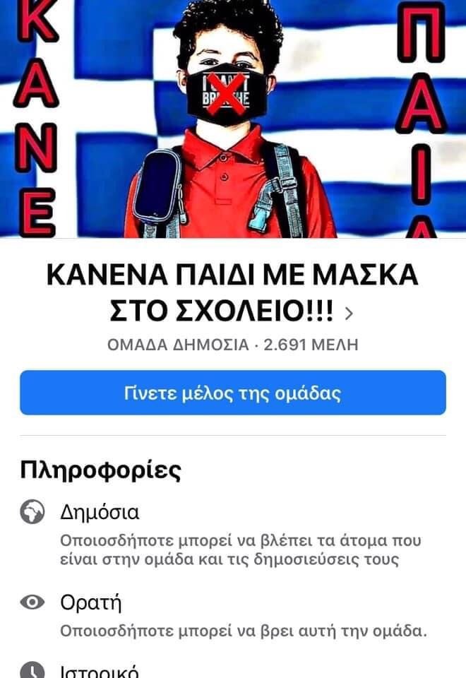 Σε κάθε περίπτωση, υπάρχουν ομάδες, όπως μια συγκεκριμένη στο Facebook, που ήδη φιλοξενεί περισσότερα από 16.000 μέλη και έχει τίτλο «Κανένα παιδί με μάσκα στο σχολείο» και φωτογραφία ένα παιδί με μάσκα, όπου αναγράφεται «I cant breathe», όπως η φράση που έλεγε ο George Floyd στους αστυνομικούς που τον δολοφόνησαν.
