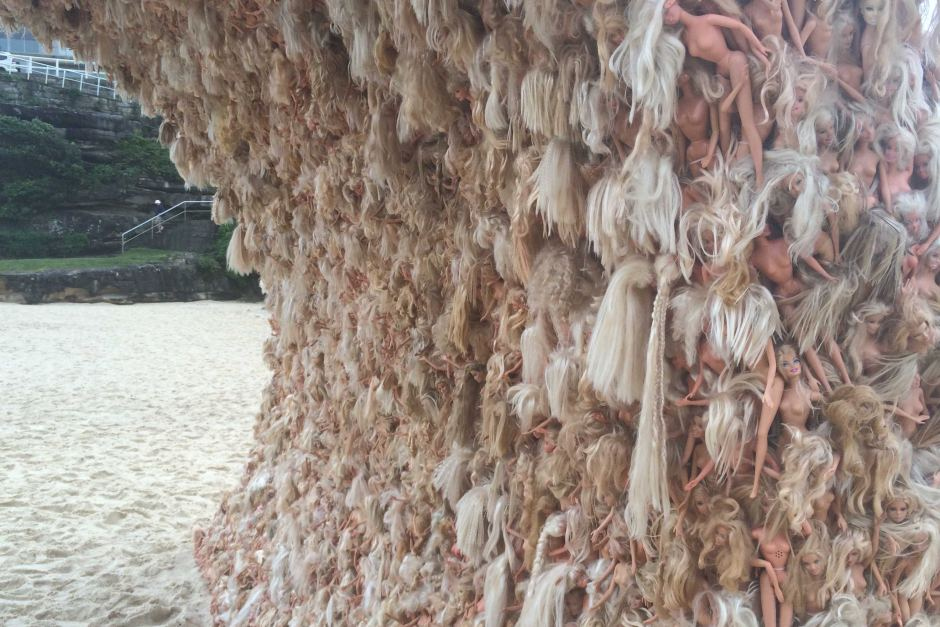 Τα γλυπτά είναι κατασκευασμένα από γυαλί, μέταλλο, φελλούς σαμπάνιας ακόμη και από κούκλες Barbie.