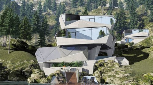 Πατώντας πάνω σε αυτόν τον σχεδιασμό, ο Wyzhevsky επιστρέφει με το CyberHouse Life, ένα αυτόνομο μεγαθήριο 1.370 τετραγωνικών μέτρων που μοιάζει να έχει ενσωματωθεί στην πλαγιά που το φιλοξενεί, πάνω από μια ορεινή λίμνη.