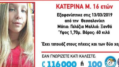 Την εξαφάνιση της 16χρονης Κατερίνας Μ. από τη Σταυρούπολη Θεσσαλονίκης γνωστοποίησε με ανακοίνωσή του, το «Χαμόγελο του Παιδιού».
