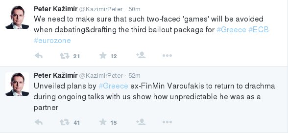 Ο Πίτερ Κάζιμιρ για παράδειγμα δεν έκρυψε τον εκνευρισμό του. «Τα πλάνα του Γιάνη Βαρουφάκη που αποκαλύφθηκαν για την επιστροφή στη δραχμή, κατά τη διάρκεια των συζητήσεων με εμάς, δείχνουν πόσο απρόβλεπτος ήταν ως εταίρος», έγραψε στο Twitter ο υπουργός Οικονομικών της Σλοβακίας.