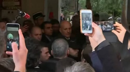 Το βίντεο δείχνει τον Μακρόν, στριμωγμένο στο κέντρο ενός πολυπληθούς κύκλου μεταξύ των μελών της δικής του υπηρεσίας προστασίας και του προσωπικού των δυνάμεων ασφαλείας, ανάμεσά τους αρκετοί ένστολοι αστυνομικοί, κάτω από μια αψιδωτή πύλη που οδηγεί στην εκκλησία.