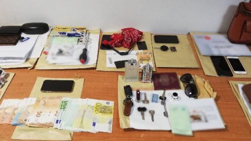 Βρέθηκαν και κατασχέθηκαν, μεταξύ άλλων, πλήθος κοσμημάτων και ηλεκτρονικών συσκευών, περίστροφα, πιστόλια, φυσίγγια, αλεξίσφαιρο γιλέκο, κουκούλα full face και πλήθος διαρρηκτικών εργαλείων.