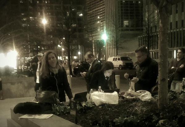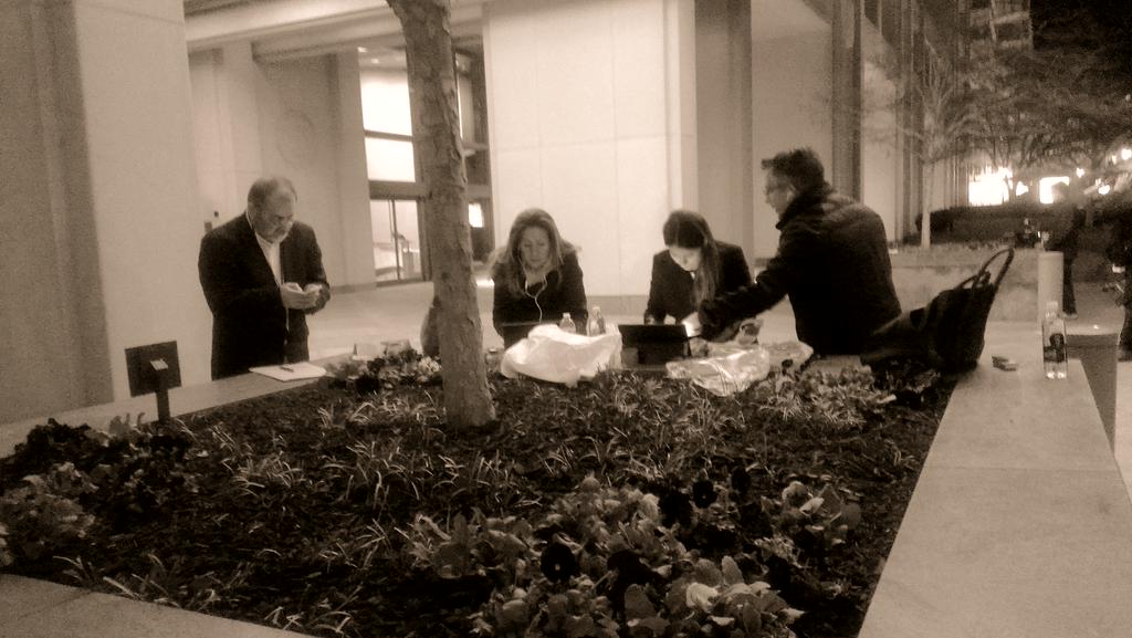 Η Λίνα Αργύρη για τη ΝΕΡΙΤ, ο Θανάσης Τσίτσας για τον ΑΝΤ1, ο Μιχάλης Ιγνατίου για το Mega, η Κατερίνα Σώκου για την Καθημερινή στήθηκαν έξω από τα γραφεία του ΔΝΤ στην Ουάσινγκτον πριν καν φθάσουν εκεί ο Ελληνας υπουργός Οικονομικών και η επικεφαλής του ΔΝΤ και φυσικά παρέμειναν μέχρι να ολοκληρωθεί η συνάντηση. Ανάμεσά τους βρέθηκε κάποια στιγμή και Αγγέλα Γκαβίρια, υπεύθυνη του γραφείου τύπου του ΔΝΤ για την Ελλάδα, αλλά και ο Ελληνας βοηθός καθηγητής πολιτικών επιστημών σε αμερικανικά πανεπιστήμια και αρθρογράφος σε διάφορα αμερικανικά ΜΜΕ Χάρης Μυλωνάς, ο οποίος μάλιστα, φρόντισε και για τον ανεφοδιασμό των δημοσιογράφων με… πολεμοφόδια, τους απαραίτητους καφέδες!