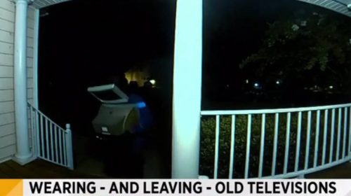 Οι εικόνες από τα κλειστά κυκλώματα δεν αφήνουν περιθώρια αμφιβολίας: ένας άγνωστος περιφέρεται τις νύχτες με μια τηλεόραση περασμένη στο κεφάλι του και αφήνει τηλεοράσεις έξω από τις εξώπορτες σπιτιών στην αμερικανική Βιρτζίνια!