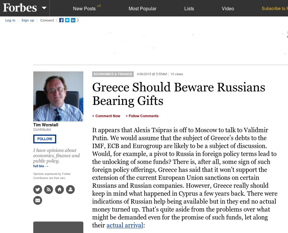 Παραφράζοντας τη γνωστή φράση από την Αινειάδα του Βιργίλιου, «Φοβού τους Δαναούς και δώρα φέροντας», ο Tim Worstall με άρθρο του στο Forbes τονίζει πως «η Ελλάδα πρέπει να φοβάται τους Ρώσους και δώρα φέροντας».