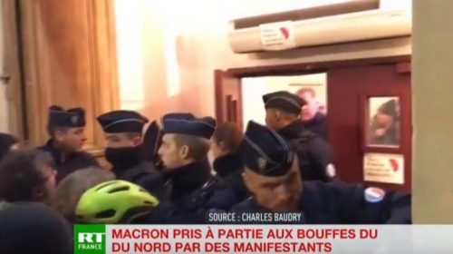 Βίντεο που αναρτήθηκαν σε μέσα κοινωνικής δικτύωσης εικονίζουν διαδηλωτές να φωνάζουν «Μακρον παραιτήσου» και κάποια στιγμή να προσπαθούν να μπουν στο θέατρο, το οποίο βρίσκεται κοντά στον σιδηροδρομικό σταθμό Γκαρ ντι Νορ, στο βόρειο Παρίσι.