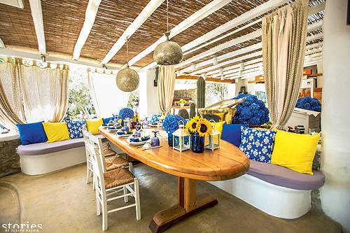 Tο πρώτο πάρτι δόθηκε στο Seasatin, στο διάσημο εστιατόριο κάτω από τους πολυδιαφημισμένους μύλους της Χώρας. Το σκηνικό που είχε στηθεί ήταν ένα μείγμα αρχαίας και σύγχρονης Ελλάδας. Κοπέλες με αρχαιοελληνικές ενδυμασίες μοίραζαν επίχρυσα στεφάνια στις κυρίες, από τη μια, ενώ από την άλλη, στήθηκε ένα γνήσιο ελληνικό γλέντι με συρτάκι και τους καλεσμένους να σπάνε πιάτα και να χορεύουν μαζί με Μυκονιάτες που έσερναν τον χορό. Ο χώρος ήταν διακοσμημένος με χιλιάδες τουλίπες ενώ για να… διαβεί το ζευγάρι είχε απλωθεί ενα κόκκινο χαλί που ξεκινούσε από την Αλευκάντρα και έφτανε μέχρι την είσοδο του εστιατορίου.