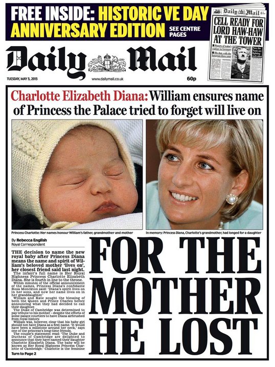Το πρωτοσέλιδο της Daily Mail είναι χαρακτηριστικό. «Για τη μητέρα που έχασε» αναφέρει χαρακτηριστικά έχοντας φωτογραφία της πριγκίπισσας Νταϊάνα και του βρέφους. Η Κέιτ Μίντλετον ήταν αυτή που, κόντρα σε όσα ήθελε το παλάτι, αποφάσισε να προτείνει στον πρίγκιπα Γουίλιαμ να δώσουν και το όνομα της μητέρας του στο δεύτερο παιδί τους. Αυτό υποστηρίζει σημερινό δημοσίευμα, αναφέροντας ότι ο Γουίλιαμ θέλησε με αυτόν τον τρόπο να τιμήσει τη μνήμη της μητέρας του, αρνούμενος να την ξεχάσει.