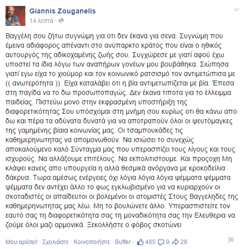 Πριν από λίγη ώρα ο Γιάννης Ζουγανέλης σε «απολογητικό» ύφος ανάρτησε στην σελίδα του στο Facebook…. ένα κείμενο για τον αδικοχαμένο Βαγγέλη…