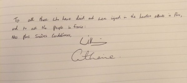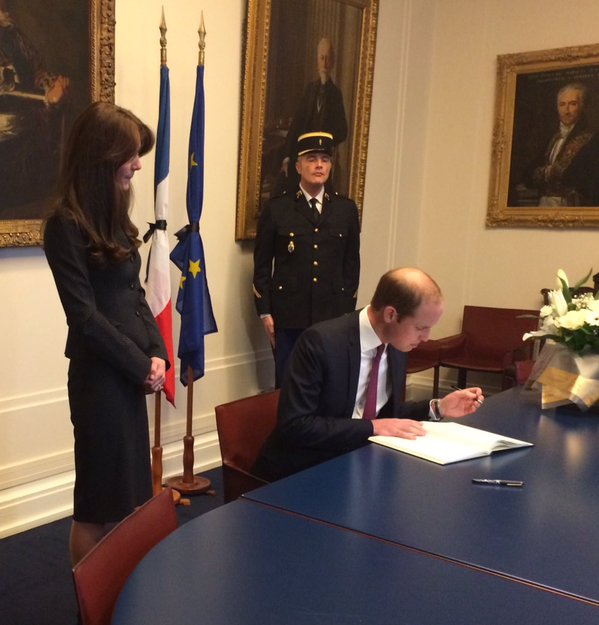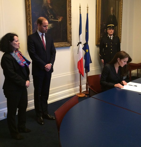 Ο Δούκας και η Δούκισσα του Κέμπριτζ υπέγραψαν στο βιβλίο συλλυπητηρίων γράφοντας και ένα μήνυμα που ανέφερε «Για όλους εκείνους που έχασαν την ζωή τους και τραυματίστηκαν στις επιθέσεις στο Παρίσι και σε όλους τους ανθρώπους της Γαλλίας: Τα βαθύτατα συλλυπητήρια μας» με την υπογραφή «Γουίλιαμ» και «Κάθριν». Μάλιστα, αμφότεροι φορούσαν συμβολικά μαύρα ρούχα για να τιμήσουν την μνήμη των θυμάτων.