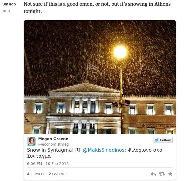 Στην live ενημέρωση του αγγλικού site από όσα συμβαίνουν στην Ελλάδα ανέβηκε φωτογραφία έξω από το Ελληνικό Κοινοβούλιο στο οποίο είναι εμφανές ότι χιονίζει με το σχόλιο «Δεν είναι σίγουρο αν αυτό είναι ένας καλός οιωνός, ή όχι, αλλά χιονίζει στην Αθήνα απόψε». Θέλοντας να συνδυάσει τις καιρικές συνθήκες στην πρωτεύουσα της Ελλάδας με τις διαπραγματεύσεις της χώρας με τους Ευρωπαίους εταίρους.