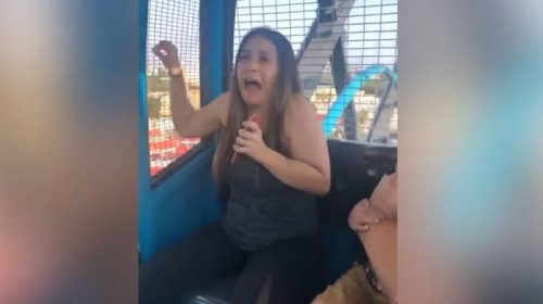 Καθώς το «βαγόνι» αιωρείται και κλυδωνίζεται, η γυναίκα έχει παραδοθεί στον φόβο της ενώ οι υπόλοιποι εξακολουθούν να τη βιντεοσκοπούν.