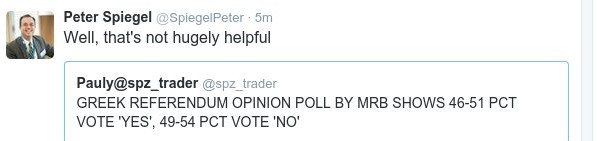 Με το που βγήκαν στον «αέρα» τα ενδεικτικά ευρήματα που δίνουν επικράτη του «Όχι», ο Σπίγκελ έγραψε στον προσωπικό λογαριασμό του στο Twitter: