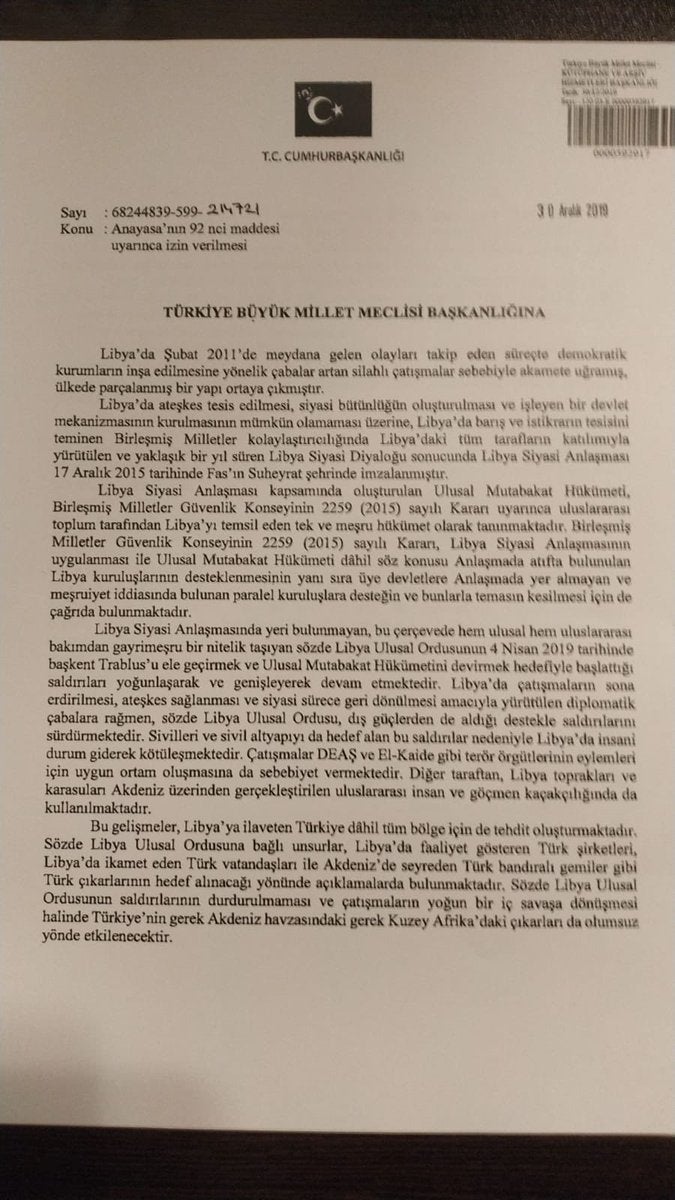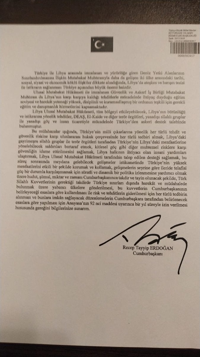 Από την άλλη πλευρά, πριν λίγο δημοσιεύθηκε η επιστολή του Ερντογάν προς το τουρκικό κοινοβούλιο, με την οποία ζητά “την εξουσιοδότηση για την αποστολή στρατευμάτων στη Λιβύη, επιτρέποντας κάθε είδους αποστολή στρατευμάτων, συμπεριλαμβανομένων και στρατιωτών αν χρειαστεί, ενάντια σε τρομοκρατικές ομάδες και παράνομες ένοπλες ομάδες”.