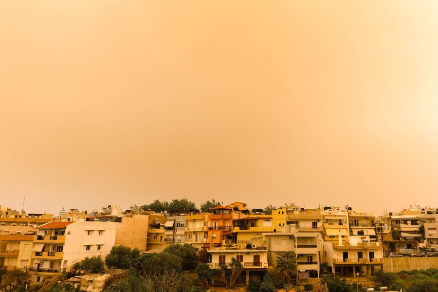 Όπως φαίνεται και στην πανοραμική φωτογραφία (INTIME NEWS / Image Online), η πόλη του Ηρακλείου έχει καλυφθεί από ένα πυκνό πέπλο σκόνης που έχει “κάτσει” πάνω από τα σπίτια και τις γειτονιές. Και εντάξει, η εικόνα μπορεί να είναι εντυπωσιακή για να τη χαζεύεις από ψηλά, αλλά για όσους κυκλοφορούν έξω ή έχουν θέματα με το αναπνευστικό, η κατάσταση δεν είναι και η καλύτερη.