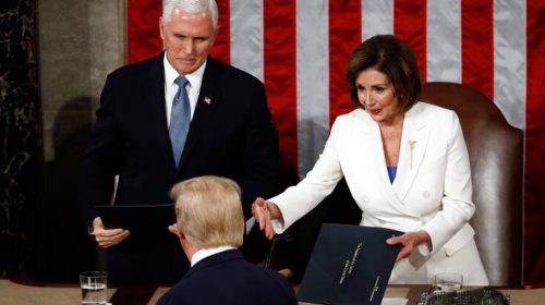 Στην έναρξη της ομιλίας του Τραμπ για την Κατάσταση της Ένωσης, η Πελόζι παρέλαβε από τον Αμερικανό πρόεδρο τον φάκελο με την ομιλία του και έτεινε το χέρι της για να κάνουν χειραψία όμως εκείνος την αγνόησε και της γύρισε την πλάτη, για να ξεκινήσει την ομιλία του.