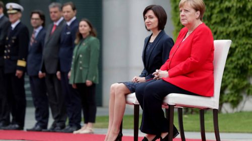 Η Μέρκελ και η πρωθυπουργός της Μολδαβίας Μάια Σάντου παρέμειναν καθιστές κατά την ανάκρουση των εθνικών ύμνων των χωρών τους στην ομοσπονδιακή καγκελαρία στο Βερολίνο. Κατόπιν σηκώθηκαν και αποχώρησαν.