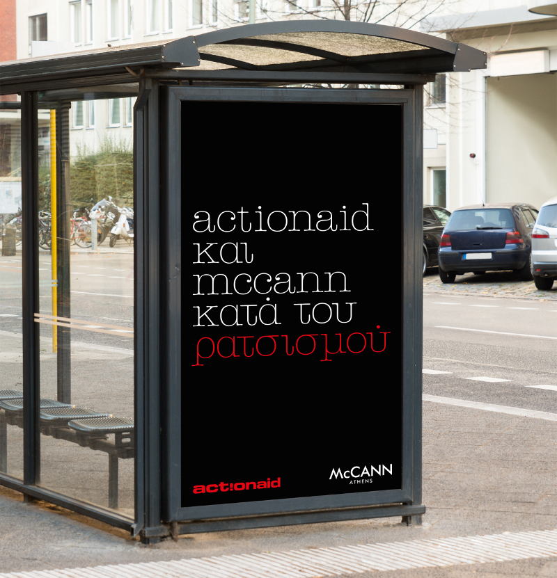 Η McCann Athens, θερμός υποστηρικτής του έργου της Action Aid και συνεργάτης της συνέλαβε και υλοποίησε για λογαριασμό της, το κοινωνικό πείραμα που προβλήθηκε με αφορμή τη Παγκόσμια Ημέρα κατά του Ρατσισμού (21 Μαρτίου). Το κοινωνικό πείραμα πραγματοποιήθηκε σε στάση λεωφορείου στην Αθήνα και σκοπός του ήταν να μας κάνει να καταλάβουμε «πόσο ρατσιστές είμαστε».