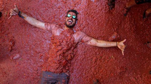 Οι οργανωτές της ετήσιας γιορτής Τοματίνα έριξαν στο πλήθος 145 τόνους υπερώριμες ντομάτες από έξι μεγάλα φορτηγά, μετατρέποντας γρήγορα την πόλη σε μια θάλασσα ροζ και κόκκινου.