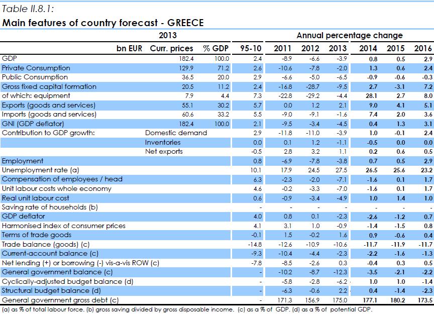 Όπως μεταφέρει και ο δημοσιογράφος των Financial Times, Πίτερ Σπίγκελ με συνεχόμενες αναρτήσεις του στο Twitter, οι εκτιμήσεις της Κομισιόν αναφέρουν πως η ανάπτυξη της Ελλάδας για το 2015 θα φτάσει στο 0,5% από 2,5% τον Φεβρουάριο. Το χρέος επί του ΑΕΠ αναμένεται να φτάσει από το 170,2% στο 180,2%, ενώ λόγω των μειωμένων φορολογικών εσόδων, το πρωτογενές πλεόνασμα πέφτει στο 0,4% από το εκτιμώμενο 1,7%.