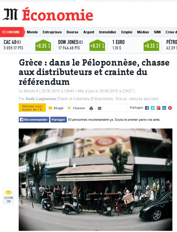 «Μια ομάδα έξι συνταξιούχων παρατηρεί τη σκηνή από την ταράτσα ενός καφέ. Ολοι τους ψήφισαν Νέα Δημοκρατία στις προηγούμενες εκλογές. Η ανησυχία είναι έκδηλη στην Καλαμάτα» σχολιάζει η Lasjaunias. «Περιμένω τη Δευτέρα για να σηκώσω τις καταθέσεις μου από την τράπεζα» λέει ο 60χρονος Δημήτρης πολλές ώρες πριν από την ανακοίνωση για την τραπεζική αργία. «Εδώ και δύο χρόνια αποσύρω σταδιακά τα λεφτά μου. Δεν έχω πλέον καμία εμπιστοσύνη» προσθέτει.