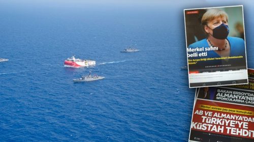 Επιθετικότερη η κυβερνητική ΑΚΙΤ τιτλοφορεί «Θρασύτατη απειλή από τη Μέρκελ και την ΕΕ κατά της Τουρκίας» γενικεύοντας το ζήτημα.