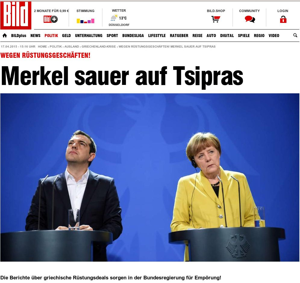 «Η Ελλάδα παρά το γεγονός ότι κινδυνεύει να χρεοκοπήσει, κάνει δουλειές με δύο χώρες: τη Ρωσία και τις ΗΠΑ. Η Γερμανίδα καγκελάριος έχει ήδη εκφράσει την οργή της στους κόλπους του κυβερνητικού συνασπισμού για τις νέες επενδύσεις της Ελλάδας στον στρατιωτικό τομέα» αναφέρει η γερμανική εφημερίδα.