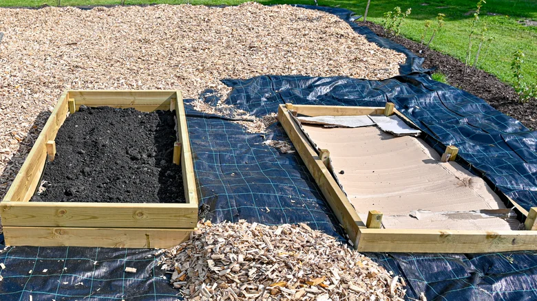 - Βήμα 3ο: Ρίχνεις από πάνω μια στρώση φυτόχωμα (topsoil) ή θρύμματα ξύλου (woodchips) μέχρι να μη φαίνεται καθόλου το χαρτόνι.