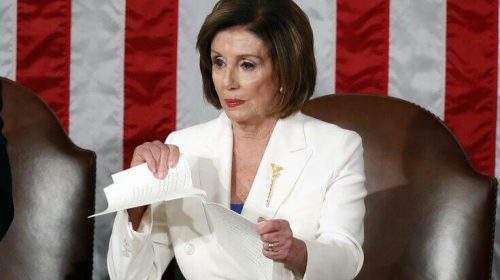 Λίγα δευτερόλεπτα μετά την ολοκλήρωση της ομιλίας του Τραμπ για την Κατάσταση της Ένωσης στο Κογκρέσο, η Δημοκρατική πρόεδρος της Βουλής έσκισε σε δύο κομμάτια το αντίτυπο του κειμένου της ομιλίας που της είχε δώσει νωρίτερα ο ένοικος του Λευκού Οίκου.
